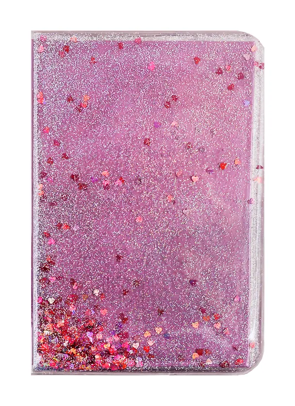Записная книжка арт.48956/15 РОЗОВЫЙ МЕТАЛЛИК (А5, 148х212, 192 стр., твёрдая обложка из металлизированной бумаги, прямые углы переплета, съёмная суперобложка из прозрачного ПВХ c закруглёнными углами, лицевая часть которой заполнена маслом и пайетками-конфетти., твёрдый переплёт 7БЦ, белый офсет, 70, глянцевая ламинация, одна краска, дизайн блока:линия, клетка, точка ,печать форзаца: одна краска, ниткошвейный, закладка: одно ляссе, каптал: есть, спр. мат: нет, ПЭТ-пакет)