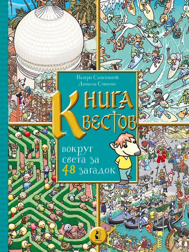 Книга напоминает виммельбух, изображения очень мелко детализированы. Итак, книга формата А4, плотная бумага, иллюстрации яркие и четкие, но при этом выполнены в милых сочетаниях белого, голубого, зелёного и бирюзового. На каждом развороте нужно найти по 2 героя. Книга квестов перенесёт вас в библиотеку, магазин игрушек, автомобильную пробку, зимний сад, в древний Египет, Японию, в Австралию и т.д.