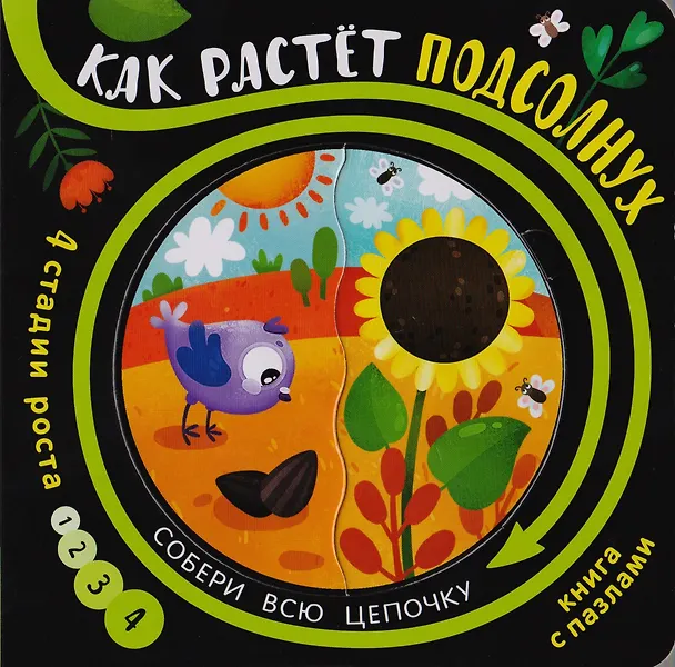 Книга с пазлами «Как растет подсолнух» из серии «Собери цепочку» познакомит ребенка со стадиями роста подсолнуха.