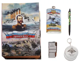 Подарочная книга-шкатулка включает в себя: зажигалку в виде обоймы, стакан на подставке, воронку с российским гербом, фляжку на 6 унций и шариковую ручку цвета хаки. Все содержимое набора упаковано в красивую картонную коробку в виде книги, стилизованной под эпоху Александра III.Металлическая фляжка декорирована принтом с изображением исторической баталии: по полю бегут солдаты во главе со своим к