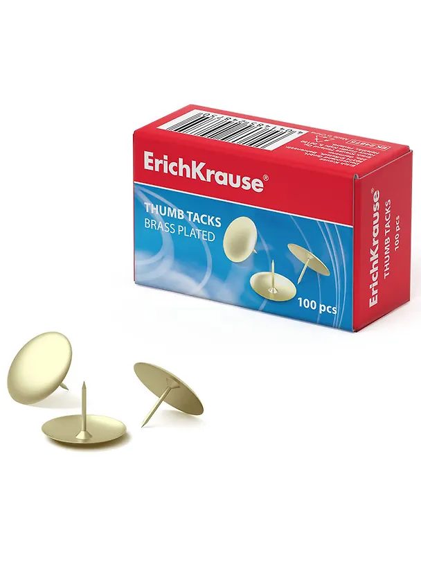 Давно пользуюсь кнопками ErichKrause. В коробке 100шт из высококачественного стального металла, хорошей прочности. Правда многократно использовать после обтягивания планшета не получается, иногда шляпки отваливаются, но не ржавеют и не пачкают бумагу. Удобно забивать в планшет/подрамник, входят легко. Цвет красивый, на свету переливаются золотисто-желтым оттенком. Коробка маленькая и удобная, изготовлена из хорошего качественного картона.