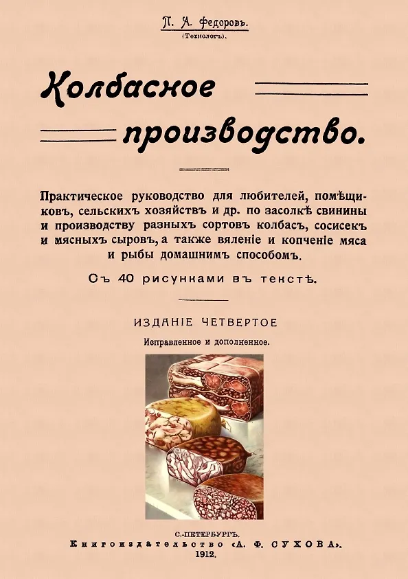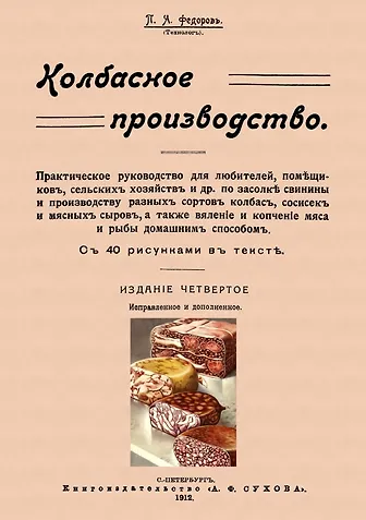 Репринт с 4-го издания. Спб. 1912 г. 40 рисунков. Более 100 старинных рецептов Царской России. От простых колбас до мясных сыров и сухих бульонов. Практическое руководство для любителей, помещиков, сельских хозяев и др. по засолке свинины и производсву разных сортов колбас, сосисок и мясных сыров, а также вяление и копчение мяса и рыбы домашним способом.