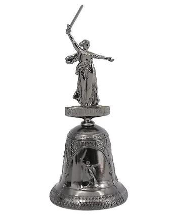 Колокольчик очень красивый, монумент Родина мать на столько реалистичный, что даже все черты лица четкие и хорошо просматриваются. Колокольчик высотой очень высокий, очень красиво смотрится в качестве украшения на полочке. Выполнен из облегченного металла, но увесистый. Оформлен колокольчик в подарочную расписную коробочку. Звенит как то притупленно, не звонко.