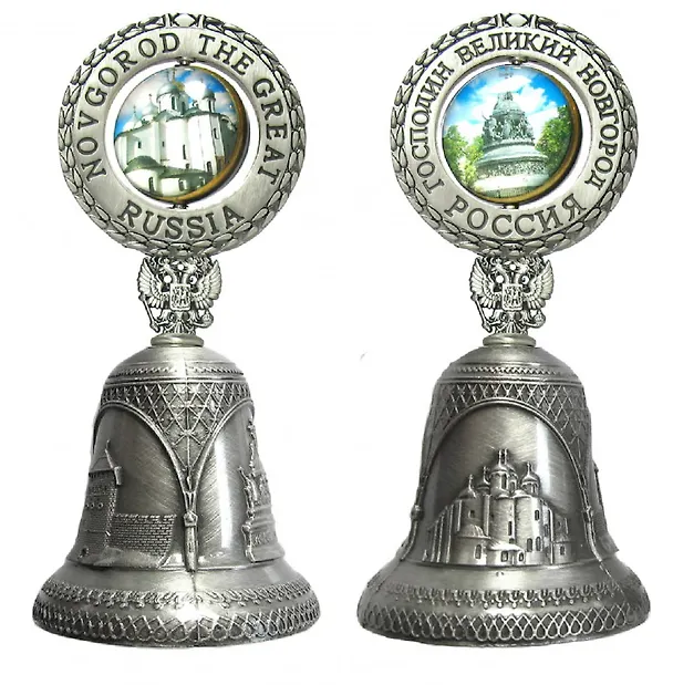Колокольчик металлический 3-вида. рельефная вставка-цветная "Великий Новгород. Софийский собор (вид снизу)-Памятник "1000-России" цвет античное олово