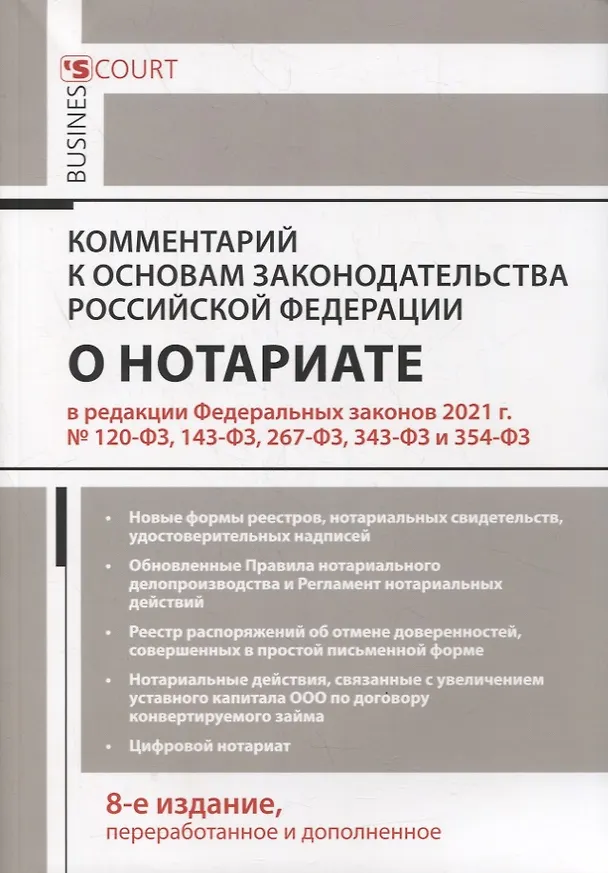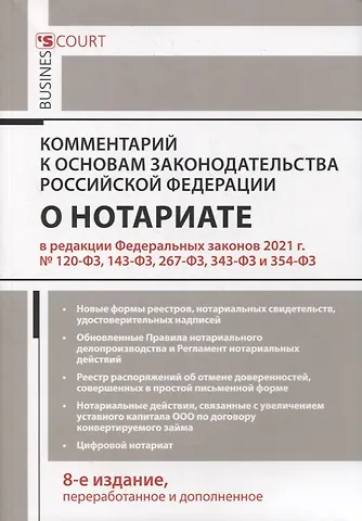 Восьмое издание комментария к Основам законодательства Российской Федерации о нотариате подготовлено с учетом последних изменений и дополнений, внесенных Федеральными законами 2021 г. № 120-ФЗ, 143-ФЗ, 267-ФЗ, 343-ФЗ и 354-ФЗ, в том числе в части создания и ведения реестра распоряжений об отмене доверенностей, совершенных в простой письменной форме, в части нотариальных действий в связи с увеличением уставного капитала ООО во исполнение договора конвертируемого займа.