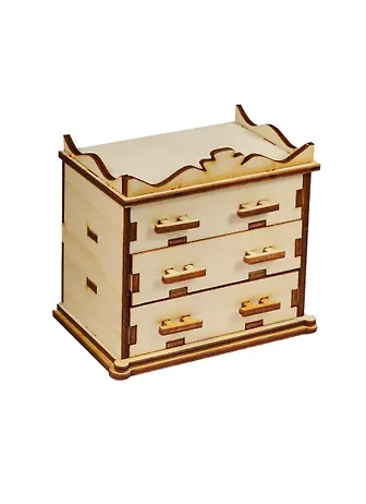 Влюбилась в эти комоды с первого взгляда, сейчас у меня их дома три штуки! Этот комод уже сам по себе законченный предмет интерьера, но при желаниеи можно его дополнить. Все грани ровные, сколов никогда не было, качество на высоте! Между ящиками есть полочки, а не просто какие-то штыречки, как бывает во многих заготовках. Ящики удобные, достаточно много всякой мелочки могут вместить — я в них храню стеклянные баночки и пробки к ним. Если комод приклеить к поверхности горячим клеем — миниатюрный органайзер во всей своей красе! А какой приятный запах древесины, когда только вскрыл упаковку! Наслаждение! Что еще важно — пропорции каждойго комода совпадают до миллиметра! Это еще один момент, который говорит о качестве данного товара на всех этапах его производства. Ну и цена — отличная.