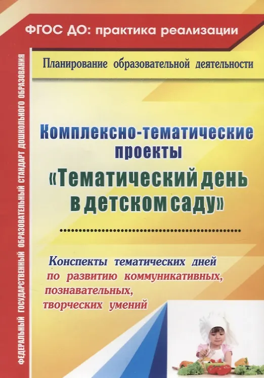 Комплексно-тематические проекты "Тематический день в детском саду" В пособии представлены сценарии тематических дней "Кто покушать нам готовит", "Кто от хвори нас излечит" для детей 5-7 лет в рамках комплексно-тематических проектов как одной из форм организации образовательной деятельности в соответствии с ФГОС ДО. Основу тематического дня составляет ведущая деятельность дошкольника - игровая. Дидактические, подвижные, сюжетные игры направлены на формирование личности ребенка, развитие его социальных, психических процессов и творческих способностей и сделают пребывание детей в детском саду интересным и занимательным. Включение в структуру тематического дня чтения с последующим обсуждением ав