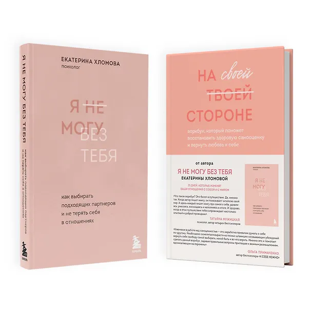 В набор вошло 2 книги: «Я не могу без тебя. Как выбирать подходящих партнеров и не терять себя в отношениях» и «На своей стороне. Воркбук, который поможет восстановить здоровую самооценку и вернуть любовь к себе».