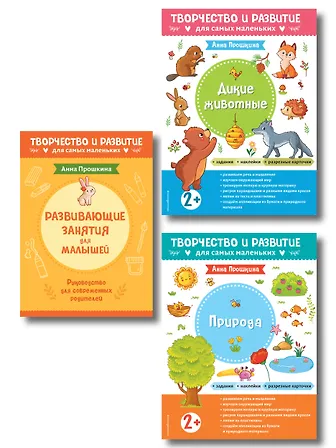Здесь черно-белое руководство для родителей и 2 цветных альбома для выполнения заданий с ребенком. В альбомах также есть наклейки, карточки для вырезания. Задания направлены на общее и творческое развитие двухлеток.