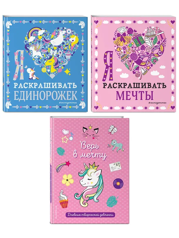 «Оживи свои мечты. Дневник, раскраски и вдохновение» — комплект из трех книг, созданный для девочек, который поможет им помечтать еще немного! В комплект входят две раскраски-покета «Я люблю раскрашивать мечты» и «Я люблю раскрашивать единорожек», которые не только развлекут, но и станут источником вдохновения. Скетчбук «Верь в мечту!», включенный в комплект, позволит девочкам записывать свои идеи, цели и достижения.