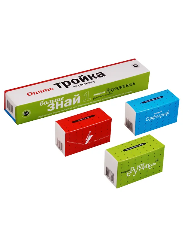 В комплект входят: игра в слова, в которых неправильно ставят ударение - «Второй Ударник литературной речи»; игра в редкие и забавные слова - «Второй Ерундопель русского языка»; игра в слова, которые часто пишут неправильно - «Второй Орфограф русского языка».