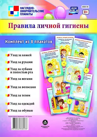 Оригинальные плакаты с яркими картинками! Содержание плакатов: 1. Уход за кожей. 2. Уход за руками. 3. Уход за зубами и полостью рта 4. Уход за ногами. 5. Уход за волосами. 6. Уход за телом. 7. Уход за одеждой. 8. Уход за обувью.