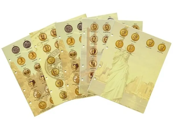 В комплект входит 5 разделителя с изображением монет Президентских долларов . Подходят для любого альбома формата Optima .