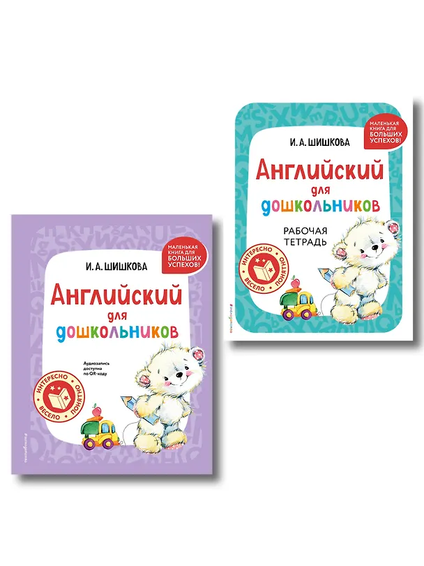 В комплект по английскому языку автора И. А. Шишковой входят книги «Английский для дошкольников (+ аудиозапись по QR-коду)» и «Английский для дошкольников. Рабочая тетрадь».