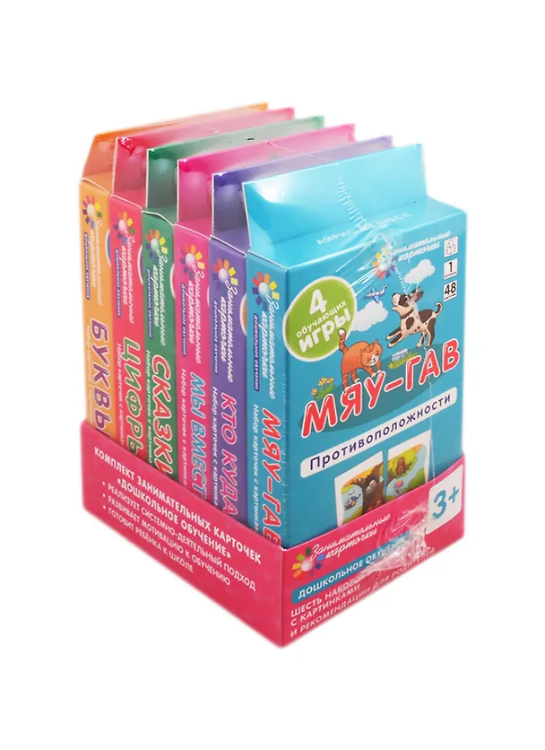 Комплект из шести наборов занимательных карточек с картинками "Дошкольное обучение" готовит ребёнка к школе и развивает: