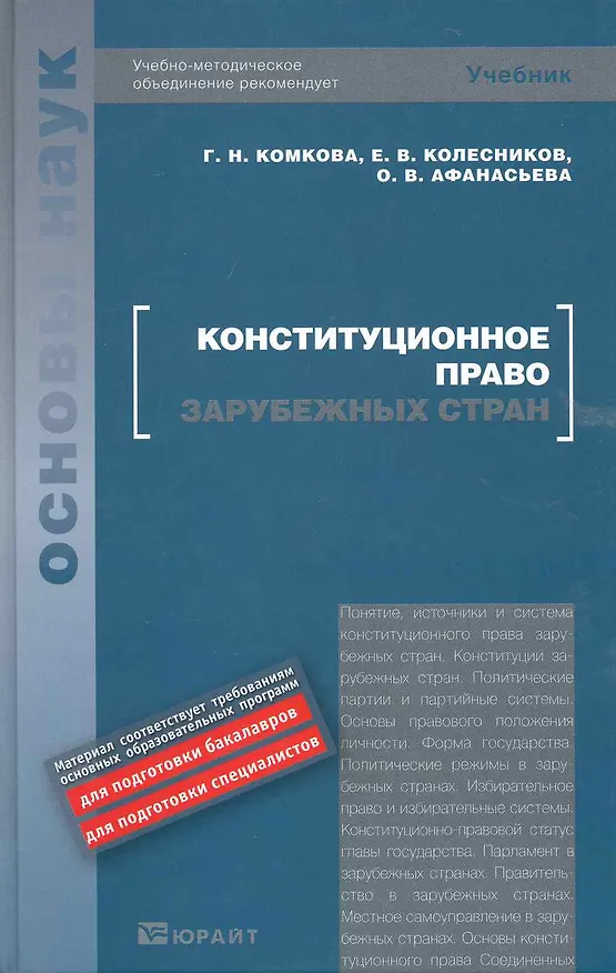 Учебник представляет собой обобщенное изложение основных тем по курсу Конституционное право зарубежных стран . В нем рассматриваются как общетеоретические вопросы конституционного права, так и основы конституционного права отдельных государств: Великобритании, Германии, Италии, Канады, Китая, Польши, США, Франции, Швейцарии, Японии. Глоссарий, составленный из основных терминов и понятий курса, поможет уяснить основные категории науки конституционного права. Содержание учебника соответствует Государственному образовательному стандарту высшего профессионального образования и методическим требованиям, предъявляемым к учебным изданиям. Учебник рекомендован к опубликованию Ученым советом юриди