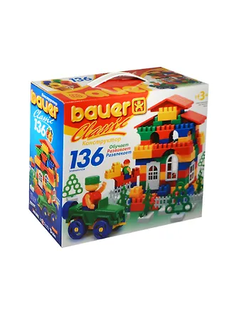 Конструктор Classik – это игрушка, которая развивает, обучает и развлекает малыша. Конструктор состоит из 136 разноцветных деталей, из них можно собрать целый город с машинками, домами и человечками. При сборке все детали легко и надежно соединяются между собой. В процессе игры у ребенка развивается пространственное мышление, фантазия, моторика рук, что способствует творческому развитию. Наборы конструкторв Bauer являются идеальной игровой базой для начинающих строителей.