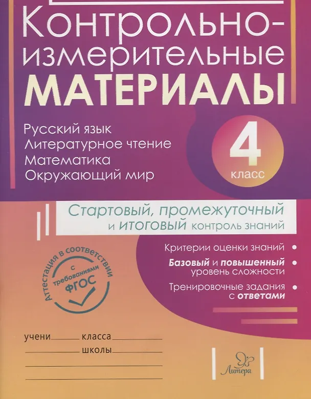 Предлагаем вашему вниманию учебное пособие с контрольно-измерительными материалами для 4 класса по русскому языку, литературному чтению, математике и окружающему миру. Оно поможет вам оценить уровень знаний первоклассников в середине и в конце учебного года.