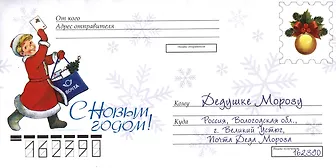 Красивый, по-новогоднему оформленный почтовый конверт для письма Деду Морозу. На конверте уже напечатан официальный адрес почты Деда Мороза в Великом Устюге. Нужно только указать свой адрес и наклеить марки, ну и само письмо, конечно, написать. Ребёнку будет интересно загадать новогоднее желание и отправить письмо в таком конверте. Конверт стандартного размера Е65.