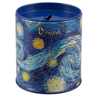 Отличная многофункциональная копилка: можно использовать и по прямому назначению, и как стаканчик под канцтовары. Самое главное в этой копилке - разумеется, дизайн. "Звёздная ночь" - одна из самых узнаваемых картин Ван Гога, которая радует глаз, независимо от того, где она изображена. Копилка выполнена качественно, хорошо прокрашена, без заусенцев, не царапает стол. Покупкой очень довольна.