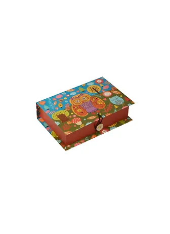 Коробка подарочная СОВУШКИ S размером 18х12х5 см выполнена из плотного картона. Плотность картона 1100 г/м2. Крышка оформлена ярким изображением. Коробка закрывается на пуговицу.