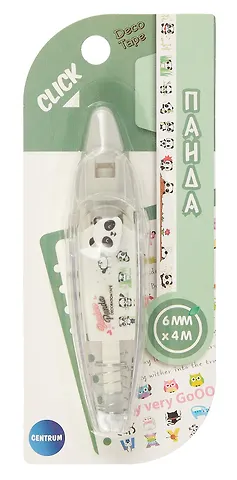 Корректор - лента Centrum "Панда". Декоративная лента предназначена не только для корректировки, но и для творчества. Преобразить страницы дневника, выделить необходимую часть текста, украсить лекции и конспекты. Корректирующая лента схожа со стандартной. Разница заключается в самой ленте. Вместо привычной белой полосы, Вы увидите привлекательные изображения в зависимости от выбранного дизайна. Работа корректора осуществляется с помощью выдвижного механизма. Нажмите на кнопку, расположенную на верхней части, далее надовите на корпус и проведите по нужному месту не отрывая руки. Пластиковый роллер, расположенный внутри контейнера, обеспечивает плавную и не прерывистую подачу ленты. Данное средство не требует высыхания, поэтому после корректировки исправленная область сразу же готова к работе. Корректирующая лента устойчива к перепадам температур. Упаковка - блистер с подвесом. Ширина ленты – 6 мм. Длина ленты – 4 м.