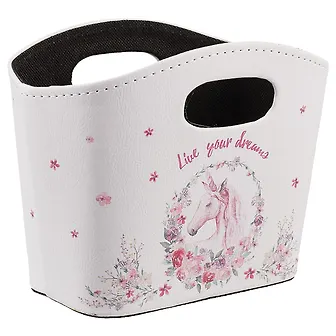 Уют в доме создают детали. Например, симпатичная корзинка для хранения с покрытием из искусственной кожи. На ней изображён нежный единорог в венке из цветов. Вы можете расставить такие корзинки по квартире и хранить в них открытки, маленькие вазочки и другие красивые вещи.