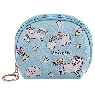 Небольшая косметичка, которую удобно взять с собой в дорогу, подойдёт активным творческим девушкам. Посмотрите, какие милые единороги скачут по её голубому фону между облачков, звёзд и радуг! Косметичка сделана из кожезаменителя, а значит, переживёт встречу с дождём или пролитым напитком. Внутри у неё тканевая подкладка, которую можно будет легко отстирать, если растечётся тушь или откроется пудра.