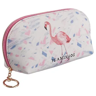Объёмная косметичка, которую удобно взять с собой в дорогу, подойдёт активным творческим девушкам. Посмотрите, какой славный фламинго вышагивает на фоне ярких пятнышек краски! Косметичка сделана из кожезаменителя, а значит, переживёт встречу с дождём или пролитым напитком. Внутри у неё тканевая подкладка, которую можно будет легко отстирать, если растечётся тушь или откроется пудра.