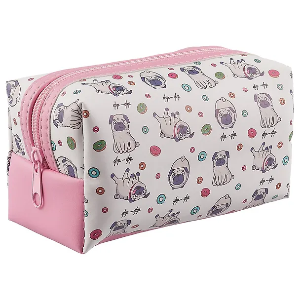 Девушкам, которые любят путешествовать, не обойтись без большой практичной косметички. Её украшает принт с забавными пухленькими мопсами. Выглядит просто очаровательно.