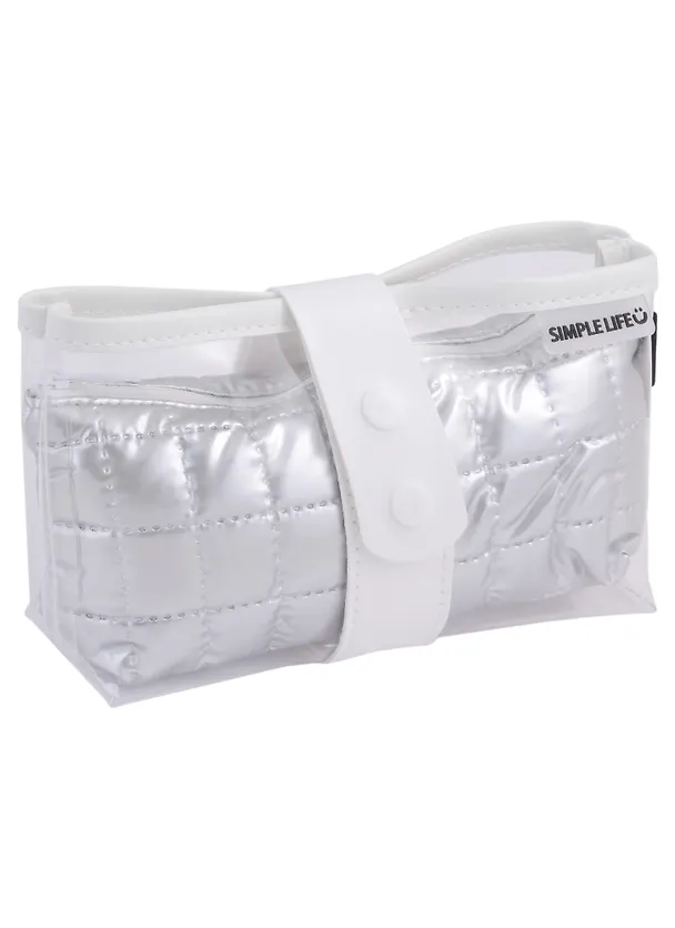 Стильное оформление, серебрянного цвета, на молнии - прекрасно открывается и закрывается без проблем (нитки нигде не торчат, хорошо сшит, соответствует своему описанию).