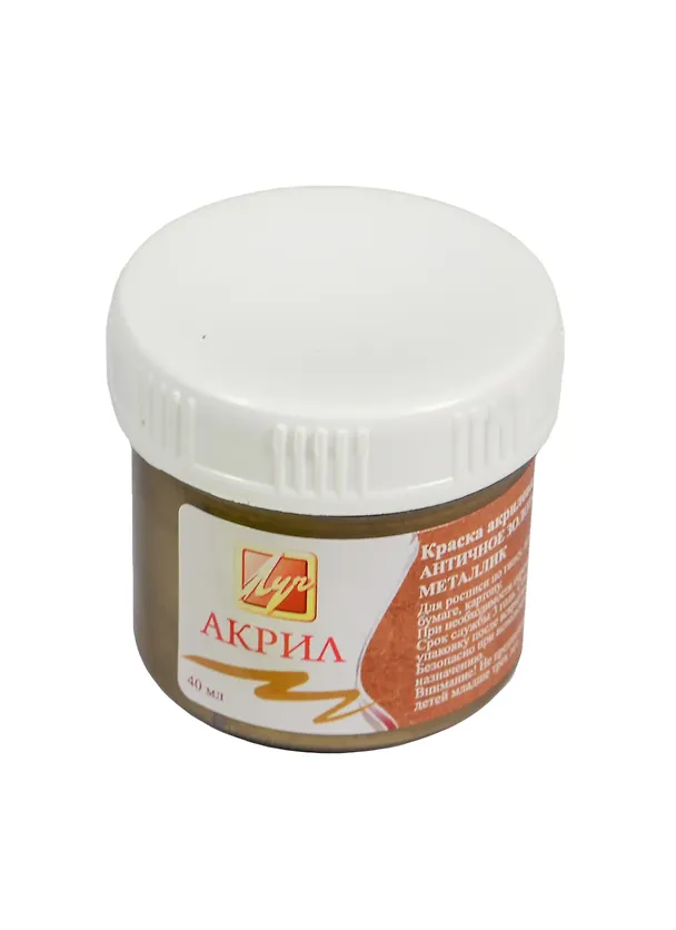 Краска акриловая «Античное золото» (тёмное), металлик, 40 мл. Произведена в Ярославле. Перед использованием ее лучше размешать. Краска умеренно жидкая, хорошо растекается, что позволяет прокрашивать не только ровные поверхности. Используется в основном для рисования и декоративных работ, но при необходимости можно подкрасить надписи на памятнике. Докупала её для пополнения набора из шести "металликов", так как она оказалась самой ходовой.