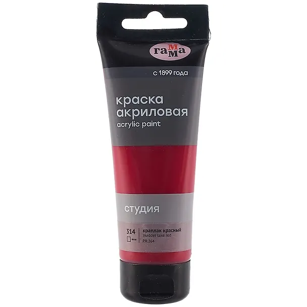 Новая акриловая краска «Студия» цвета красный краплак предназначена для художественно-живописных и декоративно-прикладных работ. Главные отличия: насыщенный цвет, густая консистенция, высокая адгезия, прочность красочного слоя. После высыхания краска становится глянцевой, практически не темнеет, специальная добавка позволяет максимально раскрыть красоту цвета. Художественный акрил прекрасно разносится, подходит для бумаги, картона, грунтованного холста, дерева, стекла, кожи, ткани. Время высыхания: от 10 минут до 1 часа в зависимости от толщины слоя. Прозрачный корпус тубы позволяет увидеть цвет краски, а удобная крышка флип-топ предотвращает высыхание. Объём тубы — 75 мл. • Цвет: крапла
