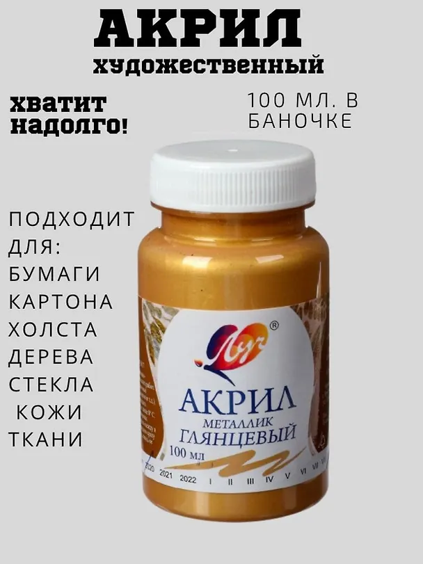 Один из моих любимых "металликов". Обладает высокой укрывистостью, быстро сохнет, равномерно ложится на бумагу, холст (можно использовать в качестве грунтовки), гипс, дерево, металл, стекло, пластик. На ткань тоже хорошо ложится, использую, если вещь не будет регулярно подвергаться стирке. При нанесении на стекло и пластик я использую специальные технологии, чтобы золотой слой не "облезал", и всё держится изумительно. Люблю краски "Луч" за соотношение цена, объем, качество. Рекомендую для декоративно-прикладного творчества, для художественных работ.