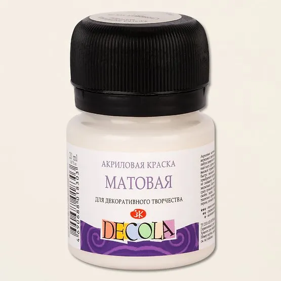 Светостойкие, устойчивые к атмосферным воздействиям краски - не тускнеют, не меняют цвет и не растрескиваются со временем; Быстро сохнут, при высыхании образуют эластичную несмываемую пленку; легко наносятся и прочно удеоживаются на любой поверхности; Практически не имеют запаха; Легко смешиваются между собой для получения новых чистых При применении матовых акриловых красок «Decola» декорируемая (окрашиваемая) поверхность приобретает бархатистый матовый вид.