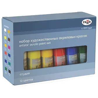 Набор новых акриловых красок серии «Студия» предназначен для художественно-живописных и декоративно-прикладных работ. Главные отличия: насыщенные цвета, высокая адгезия, прочность красочного слоя. После высыхания краски становятся глянцевыми, практически не темнеют, специальная добавка позволяет максимально раскрыть красоту цветов. Время высыхания: от 10 минут до 1 часа в зависимости от толщины слоя. Прозрачный корпус туб позволяет увидеть цвета красок, а удобная крышка флип-топ предотвращает высыхание. Объём тубы — 75 мл.