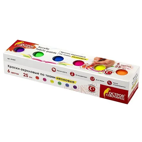 Хороший набор, с яркими неоновыми цветами, дополняют базовый. Яркие, на белой базе очень нравится эффект, можно и смешать для дополнительного оттенка. Удобный формат в виде раздельных баночек с крышкой, лучше сохраняется краска. Хотя объем не большой, для мелких деталей или небольших рисунков на одежде их хватит. Быстро не пересохнут зато. После высыхания выглядят хорошо.