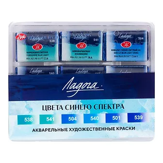 Профессиональные художественные акварельные краски «Ладога» изготавливаются на основе натурального гуммиарабика без использования дорогостоящих пигментов в составе. Отличаются прозрачностью и чистотой цвета, что позволяет художнику работать тонкими лессировками, создавать удивительные по красоте красочные смеси. Акварель «Ладога» выпускается в кюветах объёмом 2,5 мл. Набор акварели «Ладога» из 6 цветов представлен в пластиковом коррексе.