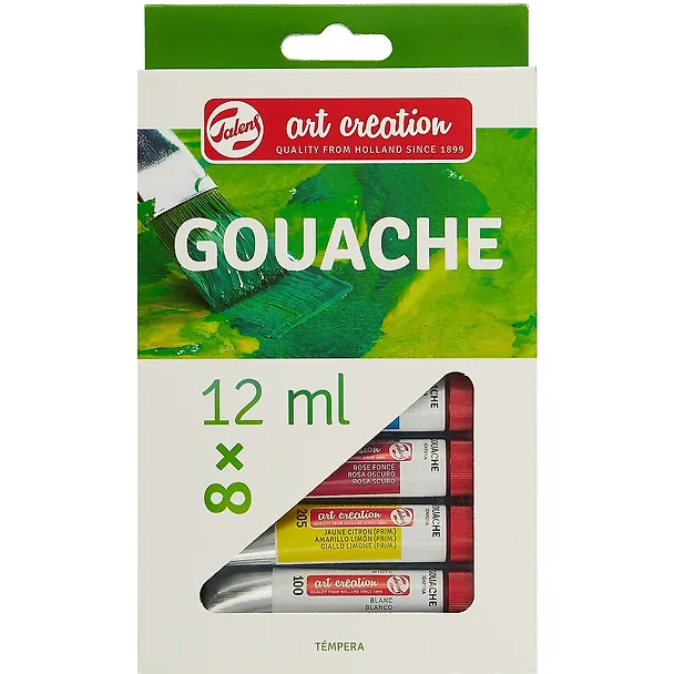 Набор гуаши Royal Talens Art Creation 8 туб по 12мл в картонной упаковке - Серия художественных материалов Art Creation - идеальный выбор для начинающих художников, студентов и учеников - Гуашь Talens Art Creation – простая в использовании: не растекается, позволяя работать тонко, не выходя за границы изображения - Гуашь легко разбавляется водой, затем быстро сохнет, становится матовой и непрозрачной, не теряя присущей ей интенсивности цвета - Можно использовать как на бумаге, так и на картоне и дереве - В наборе 8 туб по 12мл: 100-205-362-501-602-227-409-700 - Размер: 18см*11см*2см - Масса: 222 грамма Оригинальные названия цветов в наборе: White, Lemon Yellow, Deep Rose, Light Blue (Cyan),