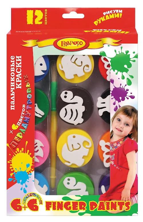 Краски пальчиковые 12цв в т.ч. 6цв перламутр. "Дети" банка 25мл, кисть, штампы, к/к, подвес, Limpopo