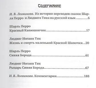 В книге представлены параллельные сюжеты о Красной Шапочке и Синей Бороде двух авторов — французского писателя Ш.Перро и немецкого литературоведа, драматурга, поэта и писателя Людвига Иоганна Тикка, больше известного русскоязычному читателю как романтик, прозаик, автор повести о Шекспире. Новый и неожиданный ракурс, свежий взгляд на давно известные, устоявшиеся в умах понятия — такой подход был присущ ранним немецким романтикам круга Людвига Тика, и именно это увидит читатель, прочтя два его произведения, "Жизнь и смерть маленькой Красной Шапочки" и "Рыцарь Синяя Борода", впервые опубликованные по-русски. Перевод с французского и немецкого языков выполнил поэт, член Союза писателей Москвы Ал