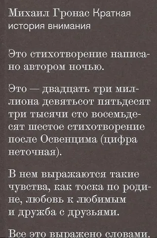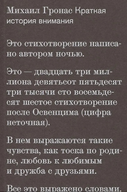 Михаил Гронас родился в 1970 году в Ташкенте. Окончил филологический факультет Московского университета и аспирантуру Университета Южной Калифорнии (Лос Анджелес). Работает в Дартмутском колледже (Ганновер). Автор поэтической книги "Дорогие сироты" (2002; Премия Андрея Белого) и научных работ в области истории и социологии культуры. Стихи, собранные в настоящей книге, написаны в 2000–2010-е годы.