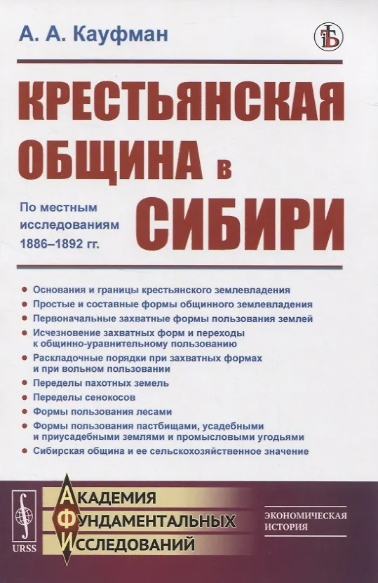 Вниманию читателей предлагается книга известного русского экономиста и статистика А.А. Кауфмана (1864-1919), посвященная изучению крестьянской общины в Сибири конца XIX века. Автор ставит целью изобразить картину земельных распорядков сибирской общины на материале исследований, проводившихся в 1886-1892 гг. в четырех губерниях Сибири - Тобольской, Томской, Енисейской и Иркутской. В работе прослеживается развитие общинного землепользования при переходе от первоначальных захватных форм к общинно-уравнительному пользованию. Описываются формы пользования лесами, пастбищами, усадебными и приусадебными землями и промысловыми угодьями. Рассматривается сельскохозяйственное значение сибирской общины.