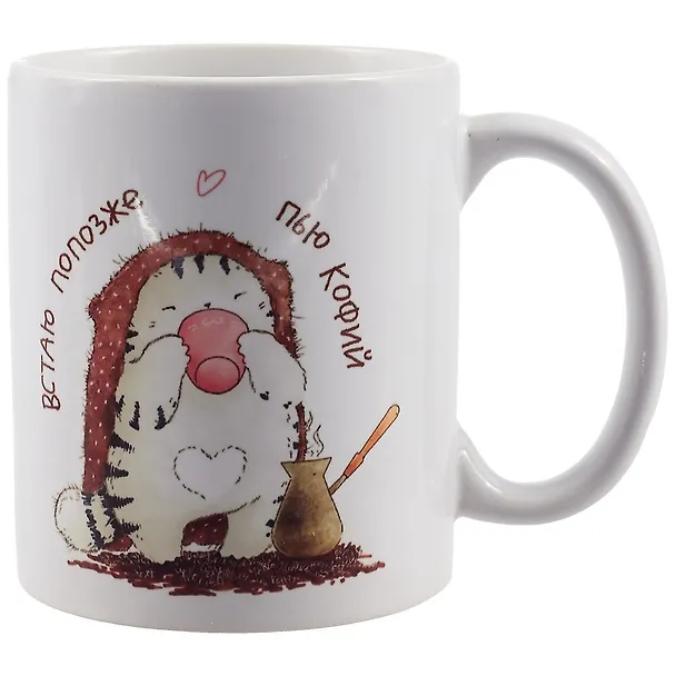 Купила как подарок для дочери, которая просто обожает кофе и котов. Кружка само очарование: на ней изображен просто умилительный котик, который олицетворяет утро, любовь к кофе. Все выполнено в мягких и теплых тонах - краски не яркие, приятные для глаз. На принт можно долго любоваться пока пьешь утренний кофе и настроение сразу поднимается. Качественное покрытие, удобная и большая ручка.