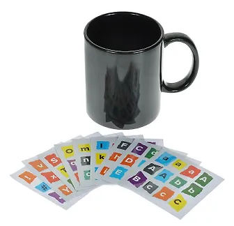 Кружка "Персональные заметки" выполнена из керамики черного цвета. В комплекте - 9 стикеров с разноцветными наклейками в виде букв латинского алфавита. С их помощью можно оставить послания, украсить кружку интересной надписью или цитатой, а также просто наклеить свое имя, если вы работаете в офисе. Наклейки можно использовать многократно.