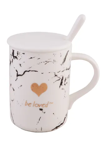 Кружка с крышкой и ложкой Мрамор Be loved (золото) (керамика) (380 мл)