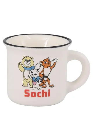 Маленькая фарфоровая кружка объёмом 75 мл в классическом белом исполнении с изображением талисманов. Сочетает элегантность фарфоровой посуды с тематическим декором, ассоциирующимся с Сочи. Подходит для подачи эспрессо, травяных настоев или в качестве памятного сувенира. Лаконичная форма и выразительный рисунок делают её удачным элементом сервировки и тёплым подарком с местным колоритом.