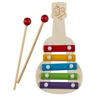 Замечательная игрушка ксилофон, выполненный в форме инструмента гитары. Не очень понятно, почему ударный инструмент изображен в форме струнного, но тем не менее:). Эта игрушка очень понравилась моему младшему ребенку, да и мне тоже. Мне она понравилась потому, что издает не слишком - то сильные и громкие звуки) А ребенок был только и раз стучать палочками по пластинам целый день. Еще мне очень импонирует то, что игрушка сделана их экологически чистого материала, ведь нет ничего лучше, чем дерево для изготовления детских игрушек.