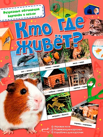 Кто где живёт? Собака в конуре, пчела в улье, а где живёт, например, корова? На этот вопрос поможем ответить эта книжка, в которой три развивающие игры - лото "Кто где живёт?", пазл и карточки-мемори. Раскладывая карточки с фотографиями животных и их "домиков", ребёнок запоминает их названия, развивает мышление, память, речь и мелкую моторику. Книги из серии "Разрезные обучающие карточки и пазлы" помогут малышам стать самыми умными и сообразительными!