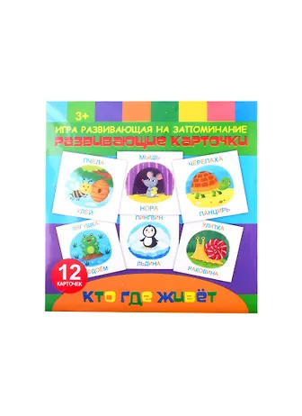Набор состоящий из двенадцати карточек на которых изображены животные и места их обитания (мышка в норе, пингвин на льдине и другие). Такие карточки очень нравятся детям. Часто играем с детьми в игру "Кто где живёт" и они очень подходят для этой игры. Благодаря им ребёнок познаёт окружающий мир. Чёткие, калоритные, развивающие, интересные карточки. Детки от них в восторге.